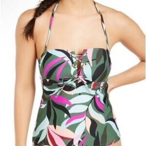 This vibrant print takes a tropic print and updates it. It features a sleek bandeau neckline that can be converted with a convertible strap. There is a lace-up front detailing, the cups are padded with non-removable cups. New with tags.