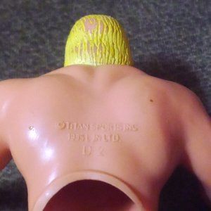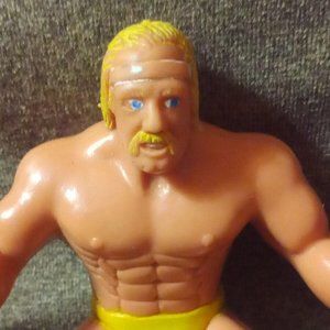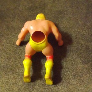Hulk hogan rubber finger puppet. Paint is fading due to age and play. Knee pads, toes of boots, and headband are faded/fading.