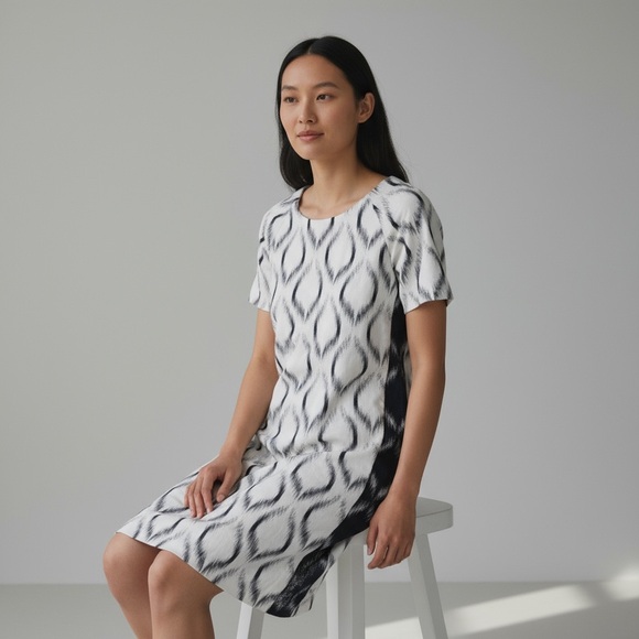 Humanoid Geometric Abstract Patterned Dress This stylish white and black dress features a unique geometric print that's sure to turn heads! The classic silhouette is perfect for a variety of occasions, from work to a night out.