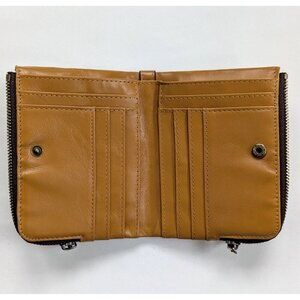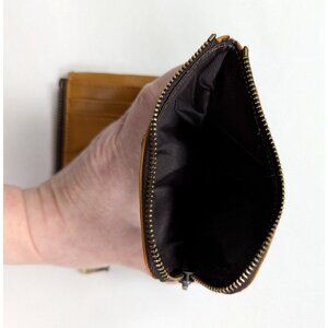 This Humerpaul leather folding wallet in dark mustard is in near perfect condition. There is very light creasing to the outside leather. The lining looks perfect and unused