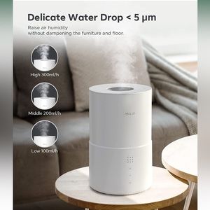 2L Large Capacity, More Effective: Raise humidity by 25% in just 20mins with a powerful and steady mist output, faster than other humidifiers. High & Middle & Low - 3 mist levels can meet all your humidity needs. The high mist mode of 300ml/h can help you quickly reach the humidity you want. The mist is fine, and the water mist of fewer than 5 microns will not condense into water droplets, and will never wet your floor and beloved furniture.