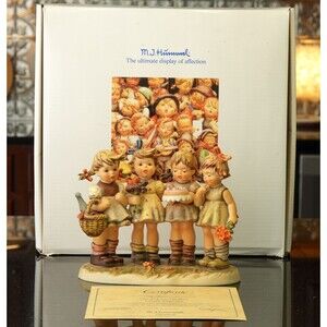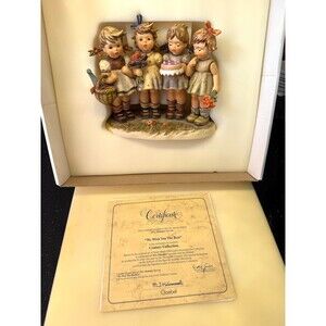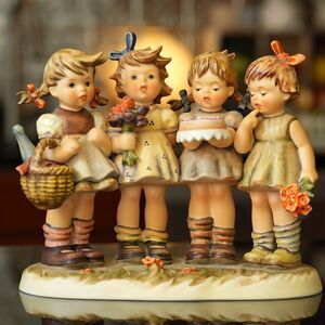 Celebrate heartfelt moments with this delightful Hummel figurine featuring four little girlseach holding a sweet gift like flowers, a basket, and a cakegathered in a thoughtful scene of good wishes and friendship. A charming piece full of warmth, color, and vintage elegance.