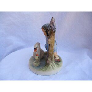 Goebel Hummel (#344) Feathered Friends, Hummel Goebel Figurine 1979-90. Measures approximately 4 1/2" tall by 3" by 4". This piece is in excellent condition, with only a few dark rub marks underneath and a little bit of crazing. A Girl looking over the fence at a swam hen and babies. What could be cuter? A perfect addition to any collection.