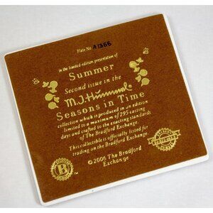 Experience the charm of Hummel's "Seasons In Time" limited edition ceramic tiles, featuring detailed depictions of children in summer and winter. These collectible tiles are dated 2005 and 2006. These were part of a set made as interchangeable tiles for a Bradford Exchange Hummel Seasons in Time clock.