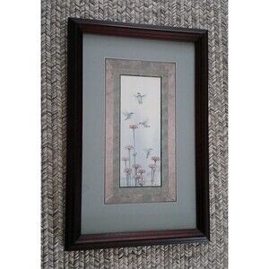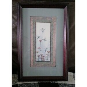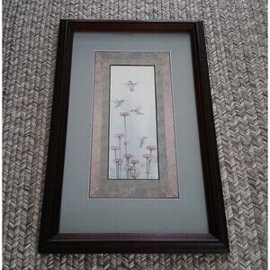 Humming Birds Flying Above Flowers Watercolor Art Print in Wood Frame 14"