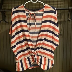 Small top but fits more like a medium Open back that ties up top Burnt orange, navy blue and cream stripes See pictures