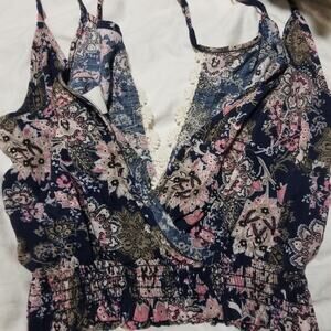 This super cute crop top has thin straps and a tie on the top of the deep v. The bottom of the cropped area is stretchy and the v is lined with a cute crochet lace design. The back also has the same deep v. Navy and pink.