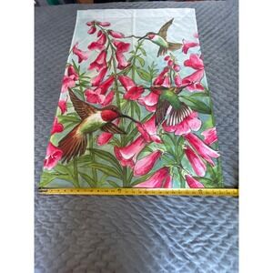 Breathtaking botanical artistry adorns this vibrant table runner, showcasing a stunning watercolor-style design. A lively scene unfolds with ruby-throated hummingbirds flitting amongst cascading pink foxgloves. The detailed artwork adds a touch of elegance and natural beauty to any space. This piece is perfect for adding a pop of color to your garden.