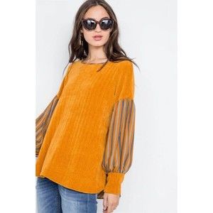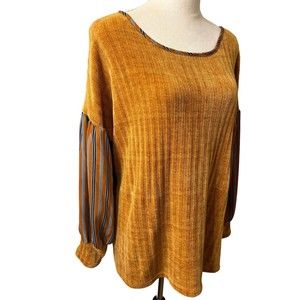 Hummingbird Mustard Mix Media Vertical Stripes Drop Shoulder Balloon Long Sleeves Soft Knit Top Sweater