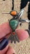 This amazing sterling silver statement hummingbird ring is a handmade piece in the Navajo style, featuring multiple stones set into the design. The body of the hummingbird is set with a large, polished cabochon of Kingman turquoise, known for its distinct green-blue coloration. The head is adorned with a vibrant, orange spiny oyster shell, while a smaller piece of Italian red coral is set at the base of the hummingbird's body, just above the tail feathers. The piece is crafted from sterling silver, with intricate details that form the beak, wings, and tail feathers, which are textured to resemble plumage. The overall design is a classic example of Southwestern jewelry, which often combines sterling silver with natural gemstones and shells. It is hallmarked on the back of the bird “handmade” and “sterling”. This is most certainly a high end piece of southwestern jewelry!