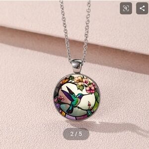 Beautiful pendant with a vibrant hummingbird design. Features colorful flowers and a silver tone chain. Perfect for nature lovers.