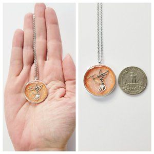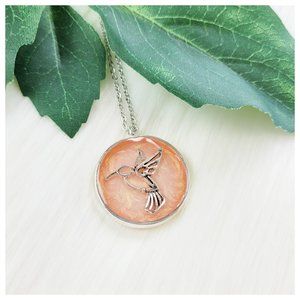 Handmade metallic peach and silver hummingbird resin pendant necklace.