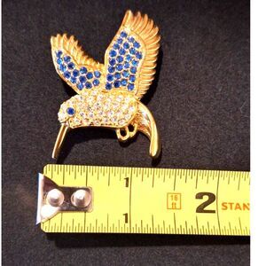 This beautiful vintage hummingbird Brooch is in very good condition, it is a shiny gold tone color and embellished with blue and white rhinestones.