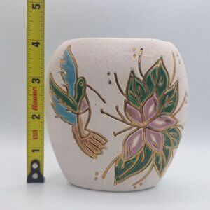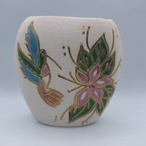 Hummingbird Pottery Vase Small Flower Gold Glaze Signed Art Hummer USA Nix Fly