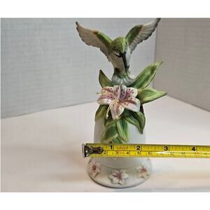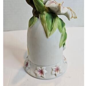 Vintage 1996 Hummingbird on Pale Pink Lily. Porcelain Bisque Bell hand painted. Artist M. Bernini designed for Seymour Mann. Medium sized, 6 inches tall, 3 inch diameter bottom. Pastel Green and White bird on Pink and white Lilly with thread stamens. Variegated leaves cascade down bell, small lilies around base. Has Original Tag, no box.