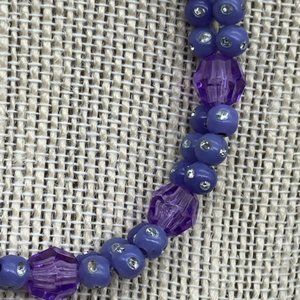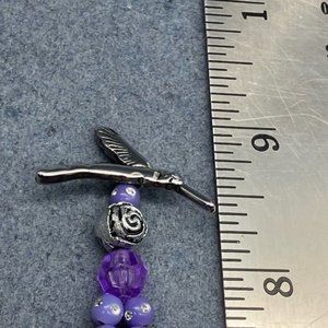 Pretty bracelet with darker and double rows of lighter purple colored beads faceted and round with sparkle, silvertone hummingbird toggle closure with rose style beads!