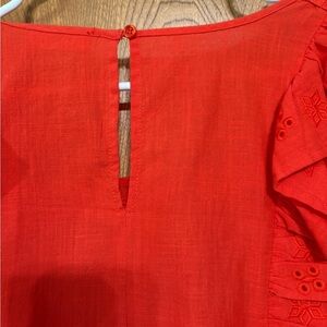 Chic red blouse with ruffled accents. Features intricate eyelet design. Ideal for stylish outings.