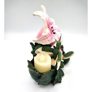 This elegant Hummingbird Votive Candle Holder is adorned with floral designs and marked DWK 2010 on the back. Standing 6 inches tall and 5.75 inches wide, it's the perfect addition to any home decor.