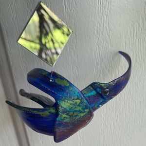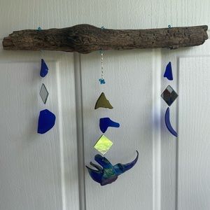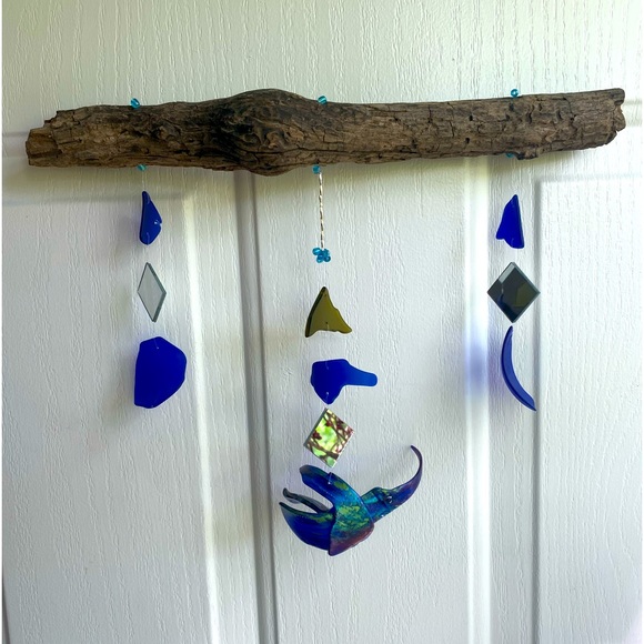 Beach glass crafted into a double sided, painted hummingbird 💕 deep blue color glass, mirrors to reflect light ☀️, on a piece of driftwood . Take care💜 fragile!!.. won’t be responsible for breaking parts due to dropping. All knots are super glued for strength.