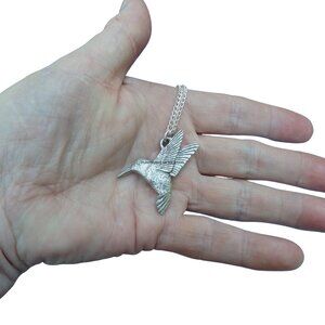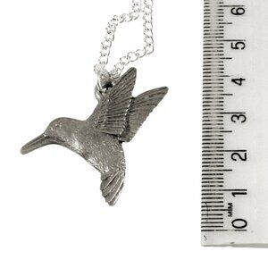 The pewter hummingbird necklace is shaped like a flying hummingbird, Archilochus colubris. This sculpted Pewter Flying Hummingbird necklace is beautifully created into utilitarian avian art, and it is sure to gratify the person interested in hovering, acrobatic ruby-throated Trochilidae.