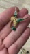 Hummingbird pendant in gold tone with green enamel and a rhinestone eye. Measures 1.5" from the tip of his wing to his tail. Excellent condition. Pendant only, no chain.