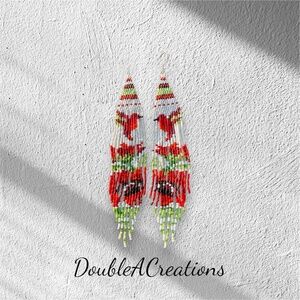 Here’s a pair of Hummingbirds Over Flowers Beaded Earrings with Fringe are lightweight and comfortable to wear all day long. Made with high quality glass Delica Beads, beaded one bead at a time. Love and passion goes into making my jewelry. This process requires focus, patience and dedication. Each bead is 16th of an inch and can take hours to complete a project.