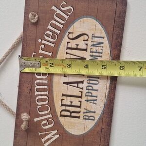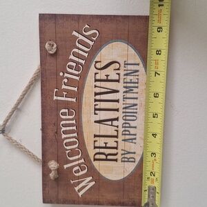 Wooden sign with 'Welcome Friends, Relatiblves by Appointment' message. Features brown and cream colors. Rope for hanging included.