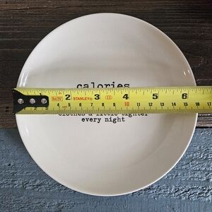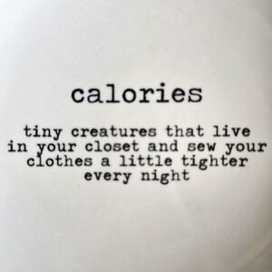 White ceramic plate featuring a funny quote about calories, which we can all relate to! 😅
