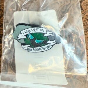 Funny enamel pin featuring a pigeon with a humorous message. Perfect for adding a quirky touch to your outfit.