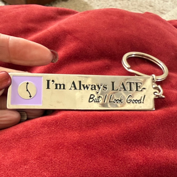 Silver keychain with a fun clock design and humorous quote. Great for adding personality to your keys.