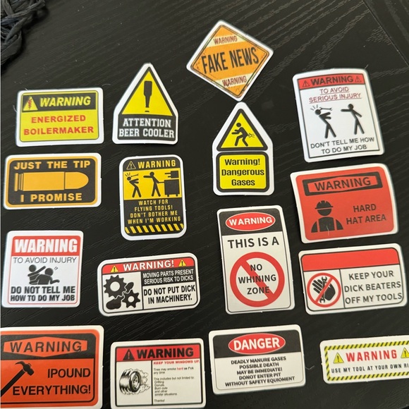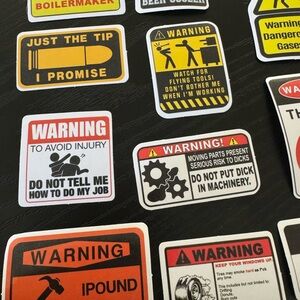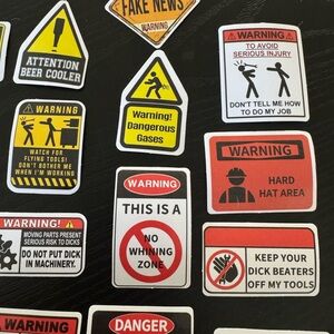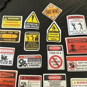 Set of humorous warning stickers with various designs. Perfect for adding a fun touch to any space.