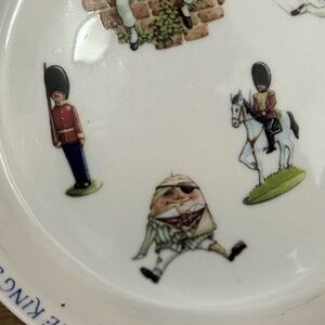 Features illustrations of Humpty Dumpty and of the King and the King's men and text from the classic rhyme. The rim of the bowl is inscribed with lines from the nursery rhyme.