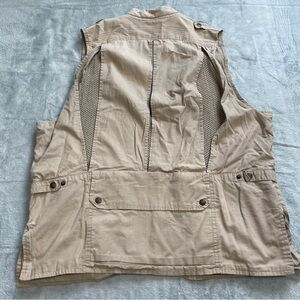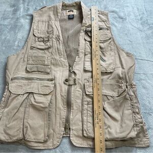 Mens Humvee safari cargo utility adventure photography vest, khaki tan, size XL. 100% cotton. Lightly worn, slight wash wear/distressing, good condition. Please see pictures for details and measurements.