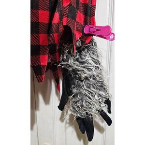 • Red plaid flannel-style shirt with attached gray faux fur chest and tattered hemline