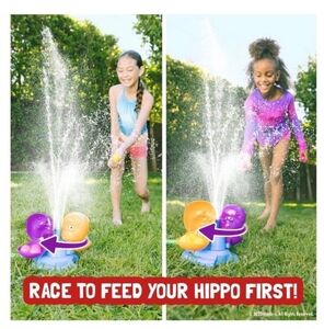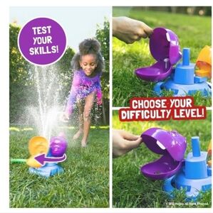Super adorable summer twist on the classic game hungry hippos. Hook up to a hose for fun outdoor sprinkler game. Feed your hippo first to win! Never used. Only opened to take photo.