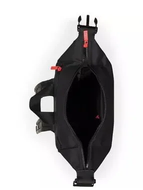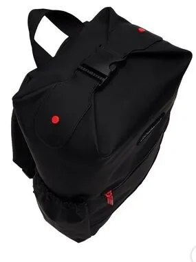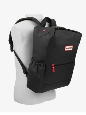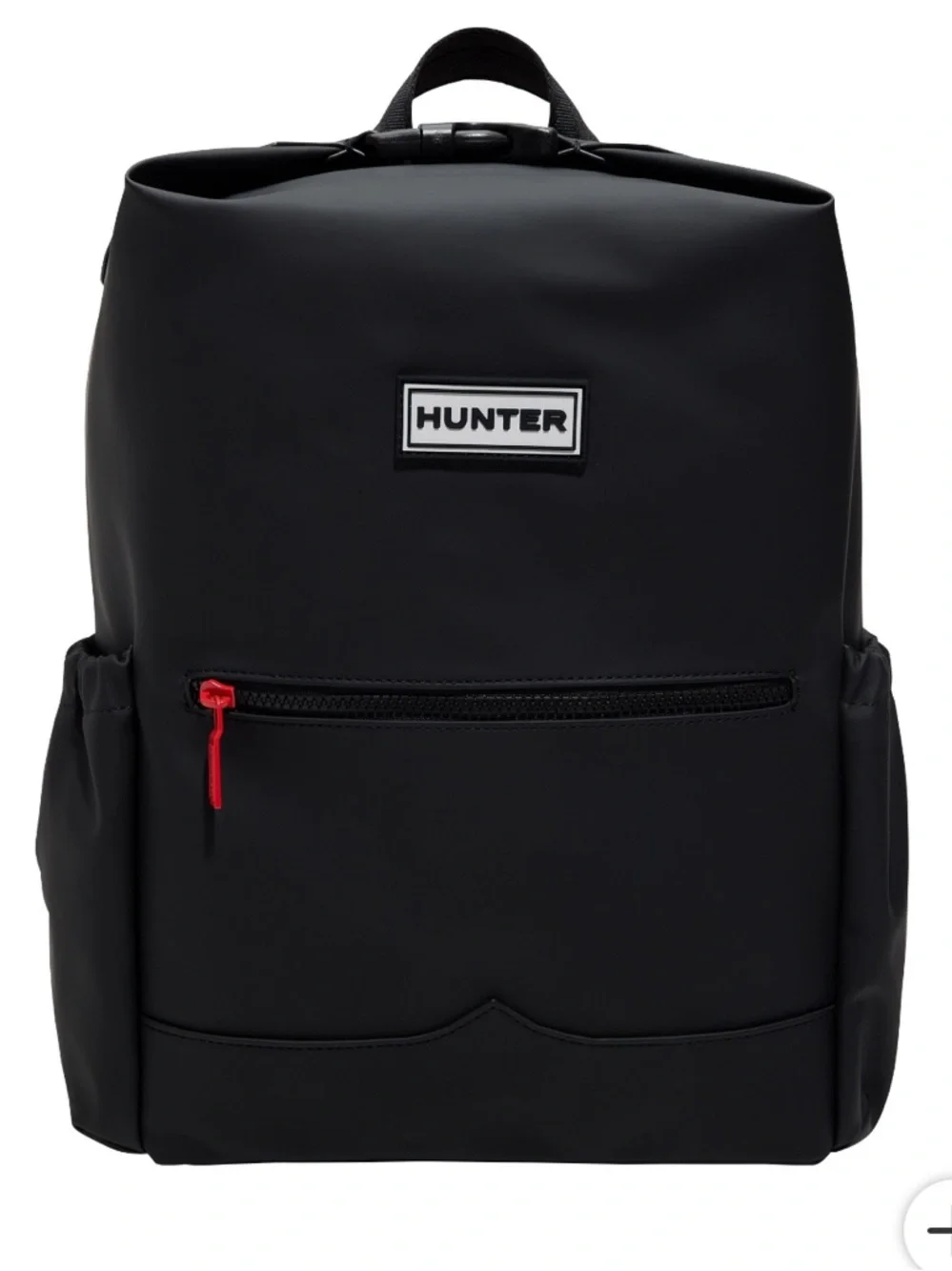 Minimalist black Hunter backpack with a bold red zipper pull. Smooth waterproof exterior and front zip pocket. Padded shoulder straps for comfortable carry. Side pockets for small items. Clean, functional style for daily use.