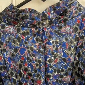 Elegant floral long sleeve dress with a high neckline. Features a vibrant pattern with blue, red, and black colors. Perfect for fall, cocktail parties, events.