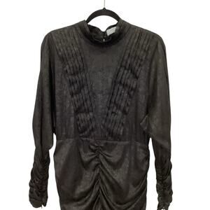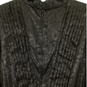 Keywords: jacquard, floral, semi lace, pleated, ruched, mini, party, special occasion, event, cocktail party, shiny, black, onyx, bodycon, edgy, luxe, high end, show stopper, designer, feminine, femme, classic, timeless, long sleeve, puff sleeve, capsule, staple
