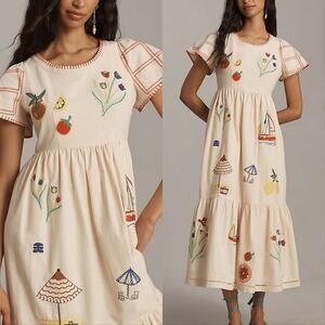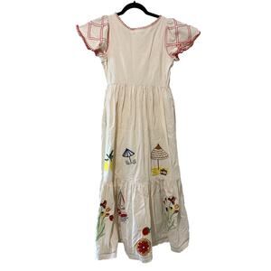 Hunter Bell Marley Dress in Summer Embroidery Cream. Women's Size 2. Features circle neckline, short flutter sleeves, embroidered motifs allover, side zip closure, fitted bodice with embroidered detail, and a long maxi length tiered skirt, lined. 100% cotton. Great used condition, no notable flaws. Retail $565.