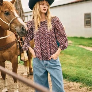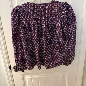 Chic top with a dynamic pattern. Features a blend of blue, red, and white hues. Perfect for any occasion.