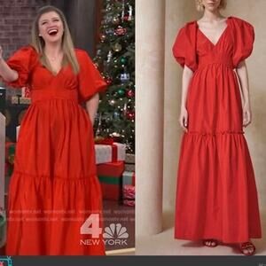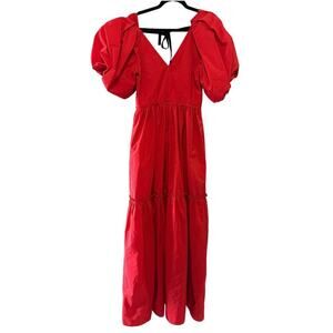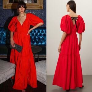 Hunter Bell Sylvie Taffeta Maxi Dress Gown in Scarlet Red. Size 6. Features dramatic puff short sleeves, flowing tiered skirt, long floor length maxi skirt, black tie back closure, hidden back zip closure, voluminous a-line silhouette. 100% polyester. Great used condition, no notable flaws. Retail $645. As seen on Kelly Clarkson. Perfect for holiday party!
