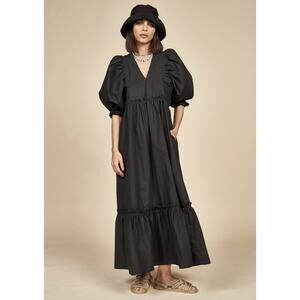 Hunter Bell Tuckernuck NY Palmer Puff Sleeve Midi Dress Black Size L 100% Cotton