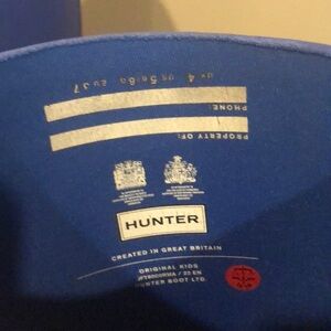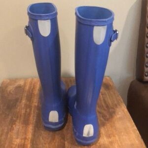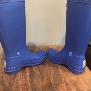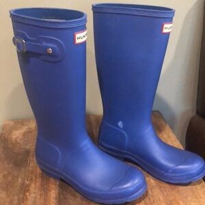 Gently used Hunter rainboots. UK 4. Cornflower blue. Slight wear, but these boots will last forever! Reflectors on Heel and top of boot on the back. Mid-shin height.