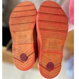 Good condition, soles are in great shape but there is discoloration around the rubber and the former owners name on the interior. Multi color camo print with lime green, orange, and bright blue. Pull on.