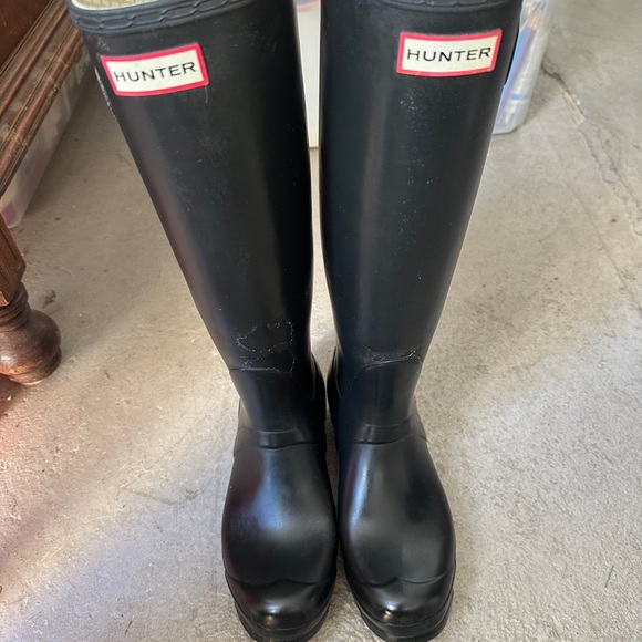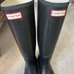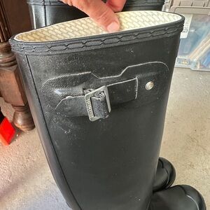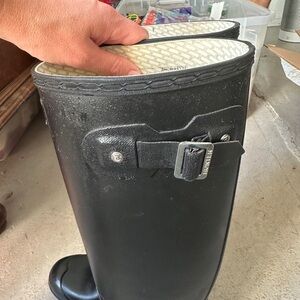 Hunter rain boots. They look good overall but please look at pictures closely. They were left on our sun porch and the LA heat was not nice to the rubber. Included are Hunter fleece boot socks.
