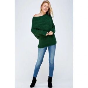 Hunter Green Soft Fuzzy Off The Shoulder Pullover Knit Holiday Casual Sweater