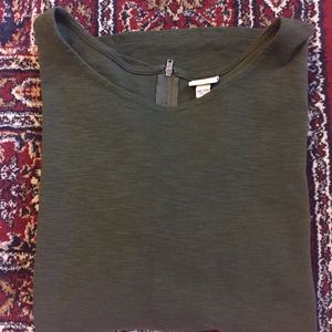 This is a hunter green colored thicker shirt from Target. Merona brand. It had a beautiful drape, with a dipper closure in the back. Rounded edge bottom.