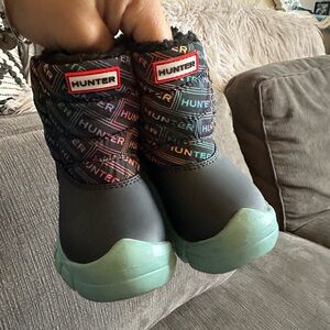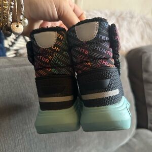 Vibrant Hunter boots with a colorful pattern. Durable sole and warm lining.