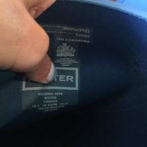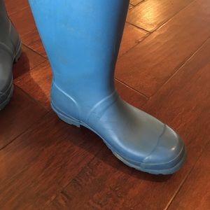 Lots and Lots of love left in these super cute, fashionable and durable blue HUNTER rain boots. Please see attached photos of wear.