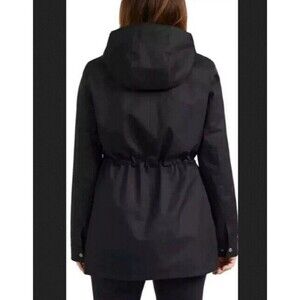 Hunter ladies rain jacket made of water-resistant softshell fabric with a polyester lining. It features a zip and snap closure, long sleeves, and is mid-length. The jacket is suitable for travel or casual wear in winter, fall, or spring. It is designed for outdoor use with a classic style.